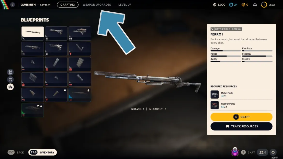برای آغاز فرآیند ارتقا، ابتدا باید میزکار مخصوص سلاح‌ها را در کارگاه خود بسازید.